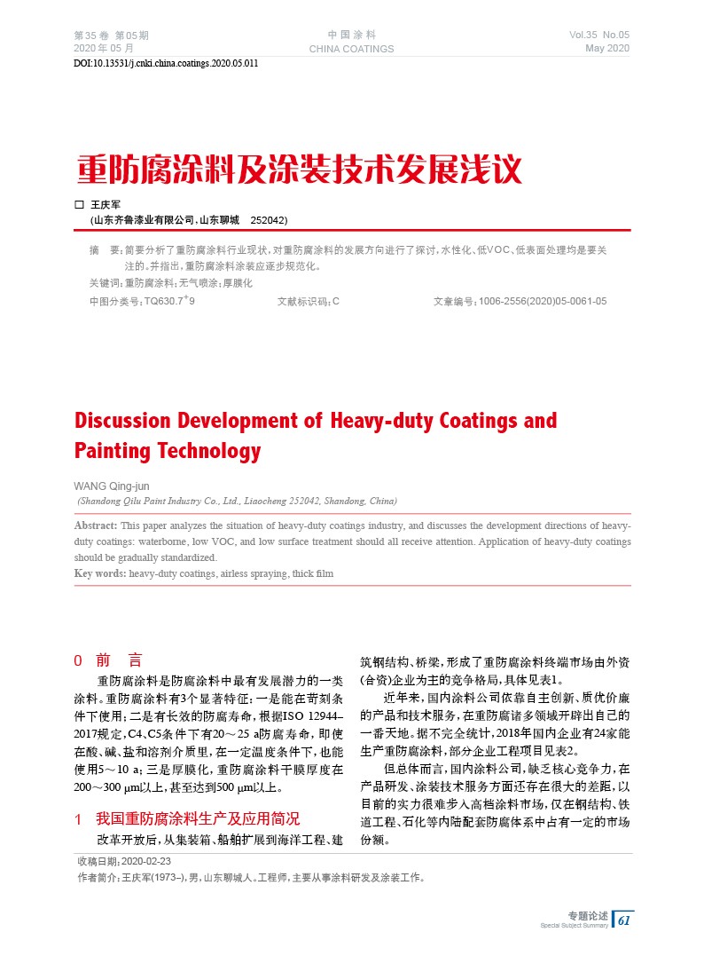 簡要分析了重防腐涂料行業現狀,對重防腐涂料的發展方向進行了探討,水性化、低VOC、低表面處理均是要關注的。并指出,重防腐涂料涂裝應逐步規范化。