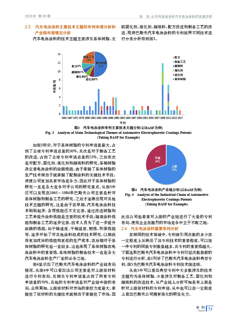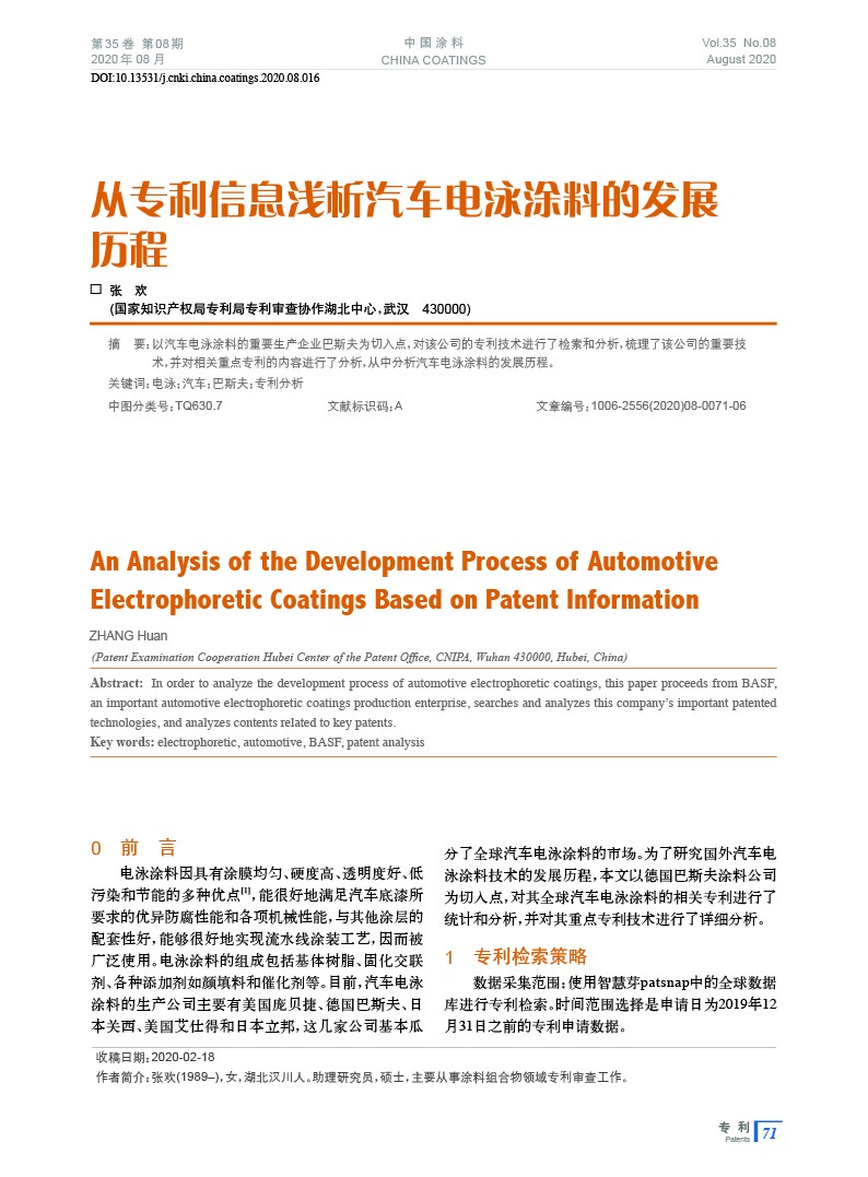以汽車電泳涂料的重要生產企業巴斯夫為切入點,對該公司的專利技術進行了檢索和分析,梳理了該公司的重要技術,并對相關重點專利的內容進行了分析,從中分析汽車電泳涂料的發展歷程。