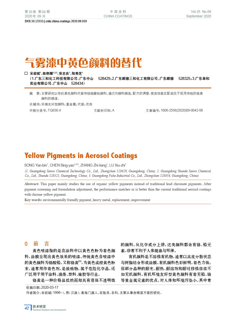 主要研究以有機黃色顏料代替傳統鉻酸鉛顏料,通過對顏料篩選,配方的調整,使其性能匹配或優于現用傳統的鉻黃顏料的噴漆。