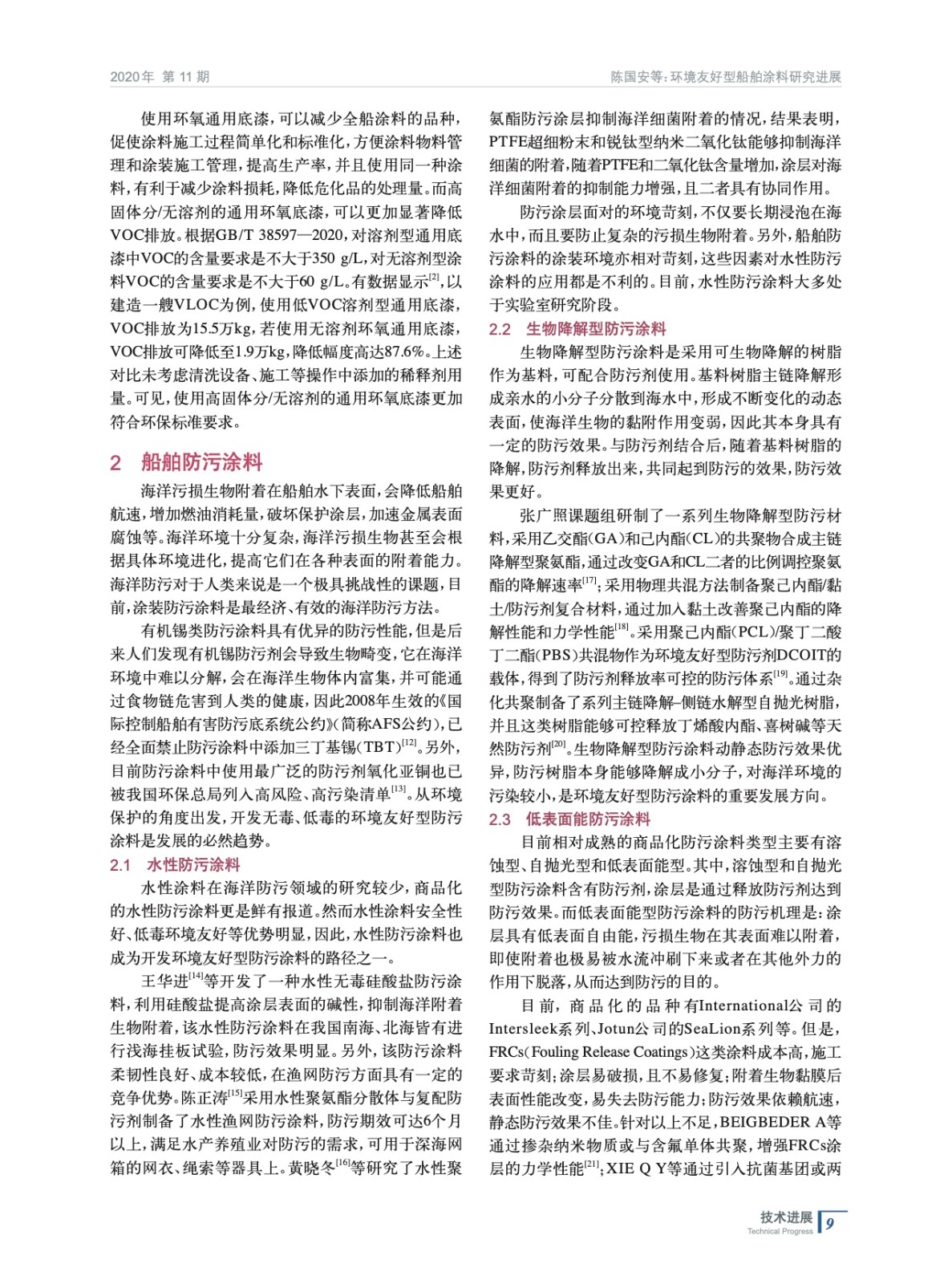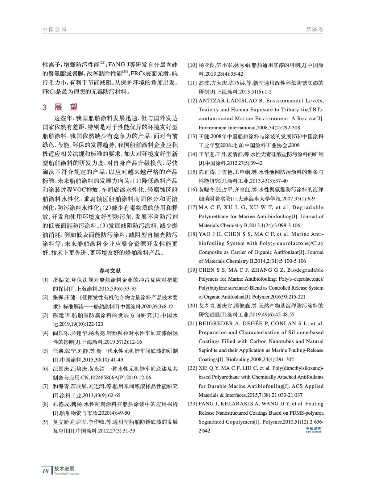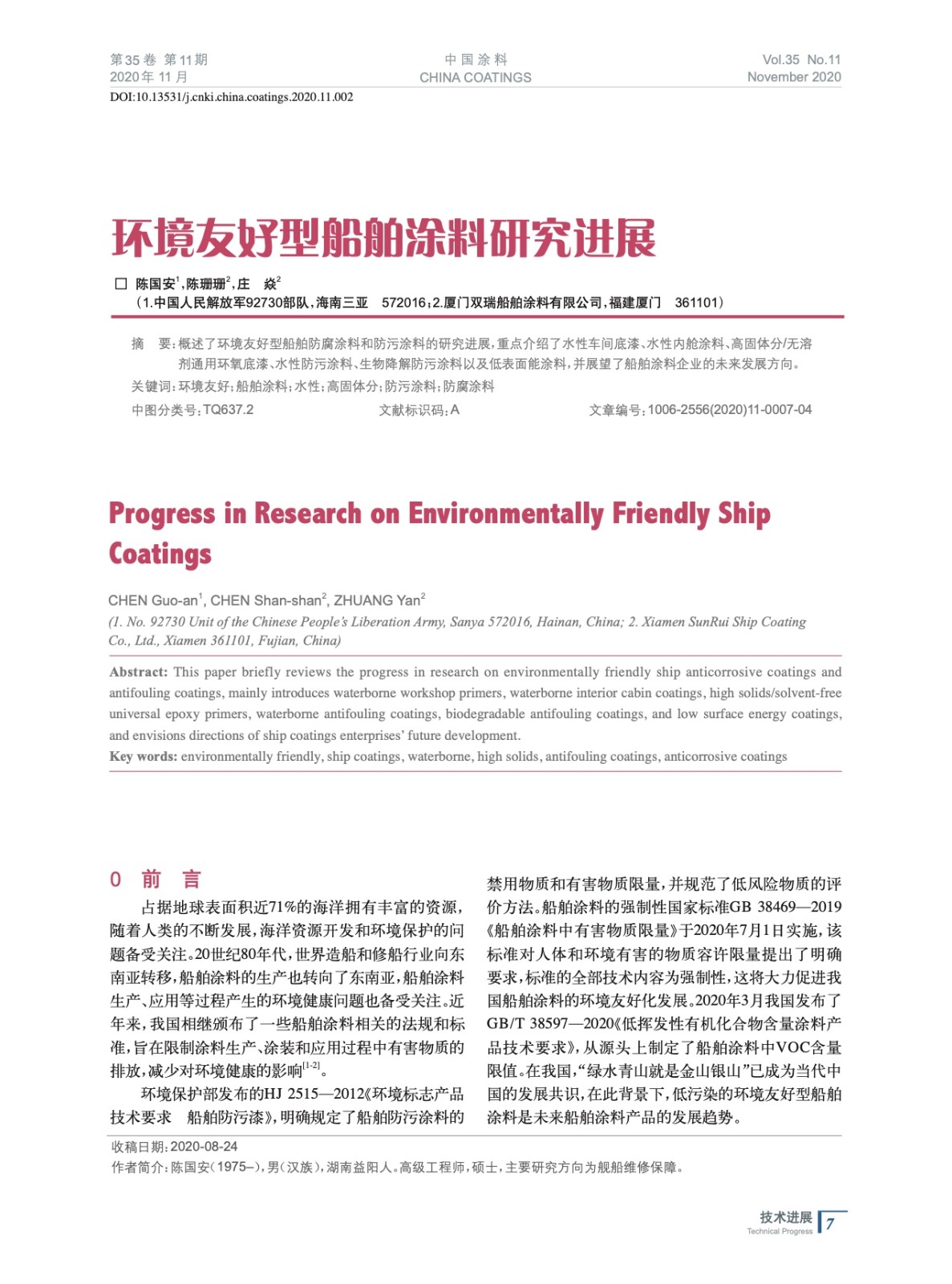 概述了環境友好型船舶防腐涂料和防污涂料的研究進展,重點介紹了水性車間底漆、水性內艙涂料、高固體分/無溶劑通用環氧底漆、水性防污涂料、生物降解防污涂料以及低表面能涂料,并展望了船舶涂料企業的未來發展方向。