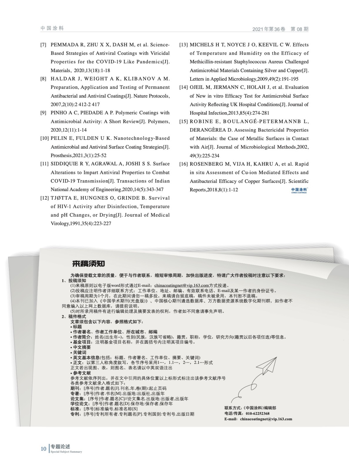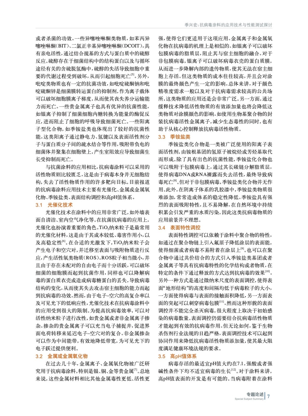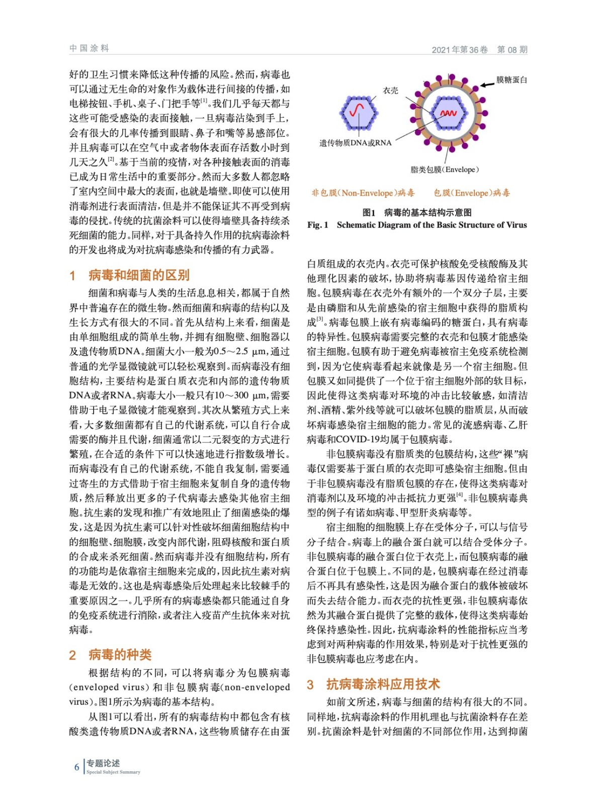 從病毒與細菌的結構差異出發,揭示了抗病毒涂料與抗菌涂料不同的作用機理,并綜述了當前抗病毒涂料的應用技術。最后討論了抗病毒涂料的性能測試方法及指標要求。