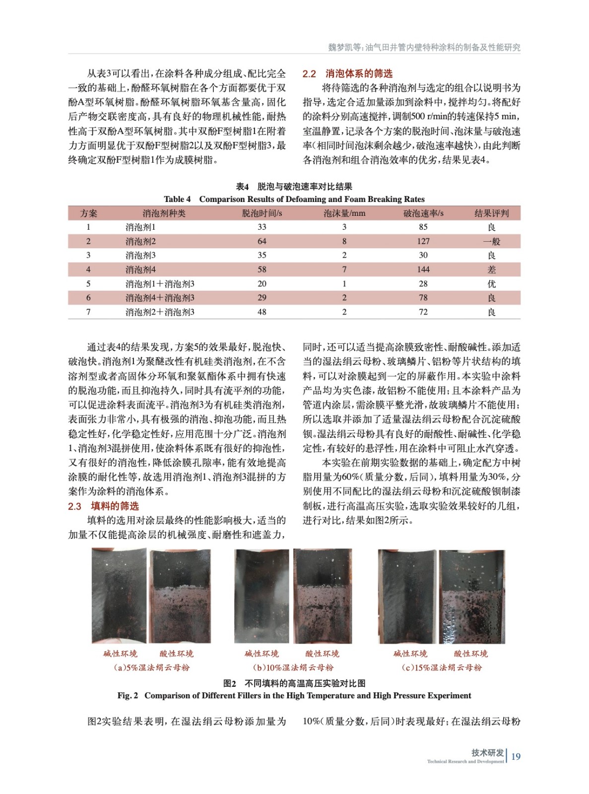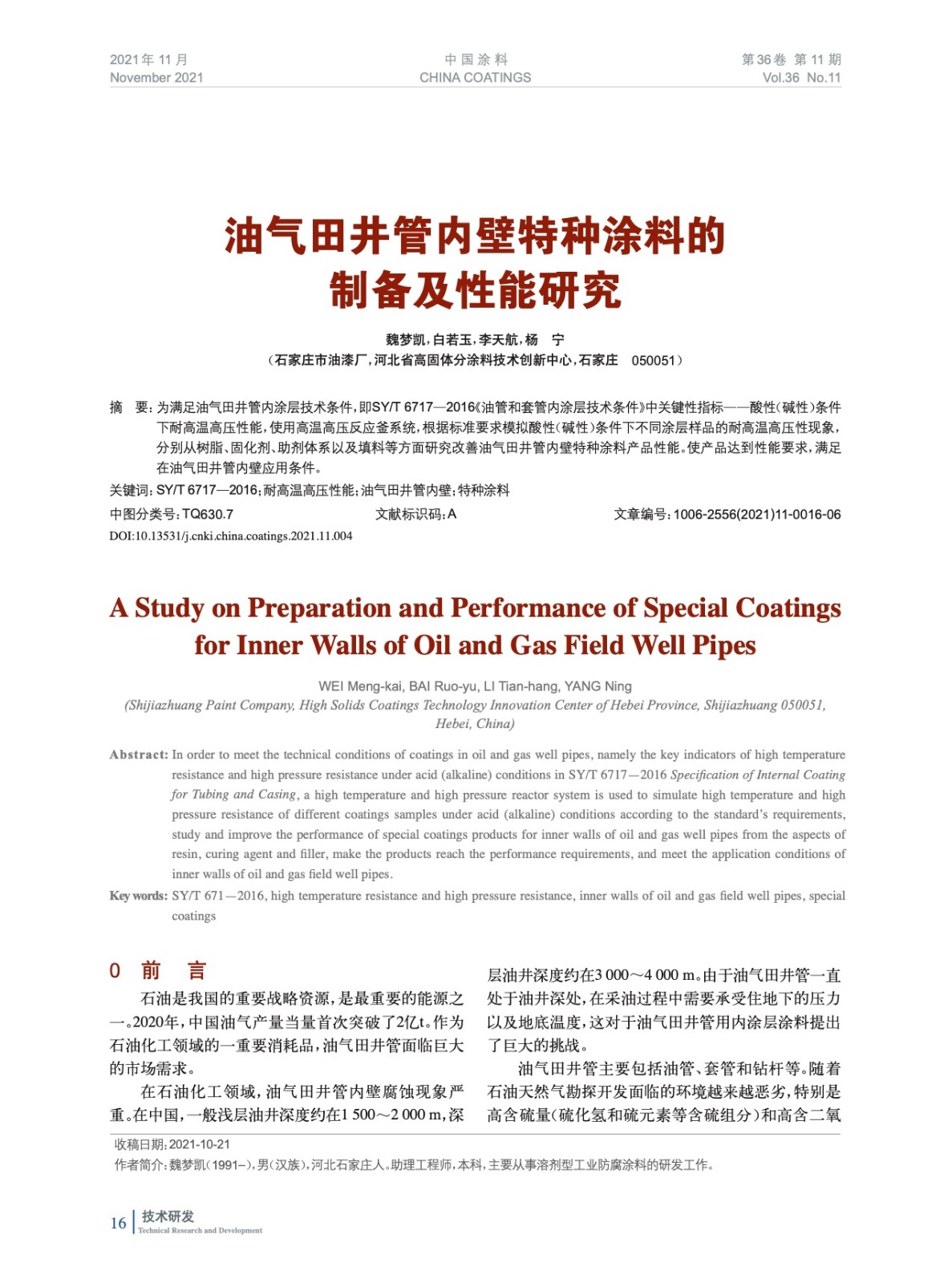 摘要:為滿足油氣田井管內涂層技術條件,即SY/T 6717—2016《油管和套管內涂層技術條件》中關鍵性指標——酸性(堿性)條件下耐高溫高壓性能,使用高溫高壓反應釜系統,根據標準要求模擬酸性(堿性)條件下不同涂層樣品的耐高溫高壓性現象,分別從樹脂、固化劑、助劑體系以及填料等方面研究改善油氣田井管內壁特種涂料產品性能。使產品達到性能要求,滿足在油氣田井管內壁應用條件。