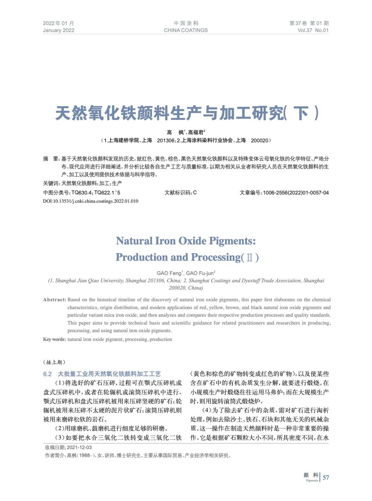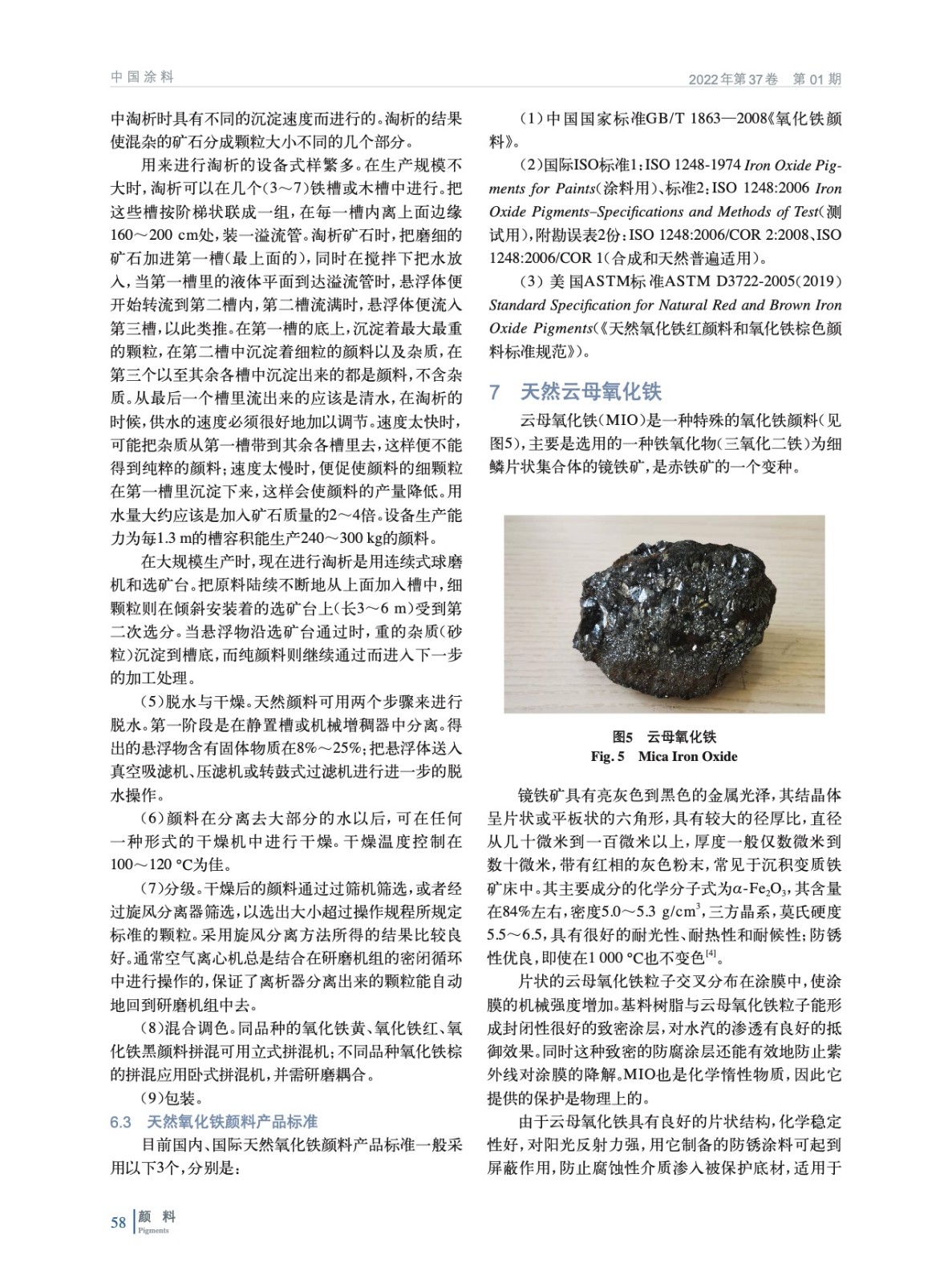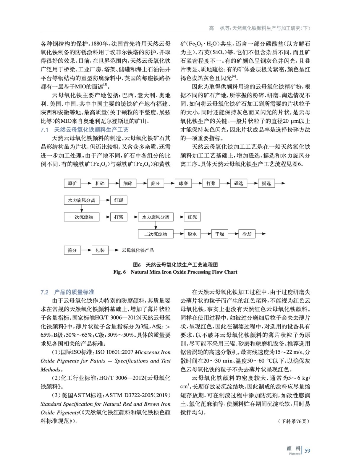 基于天然氧化鐵顏料發現的歷史,就紅色、黃色、棕色、黑色天然氧化鐵顏料以及特殊變體云母氧化鐵的化學特征、產地分布、現代應用進行詳細闡述,并分析比較各自生產工藝與質量標準,以期為相關從業者和研究人員在天然氧化鐵顏料的生產、加工以及使用提供技術依據與科學指導。