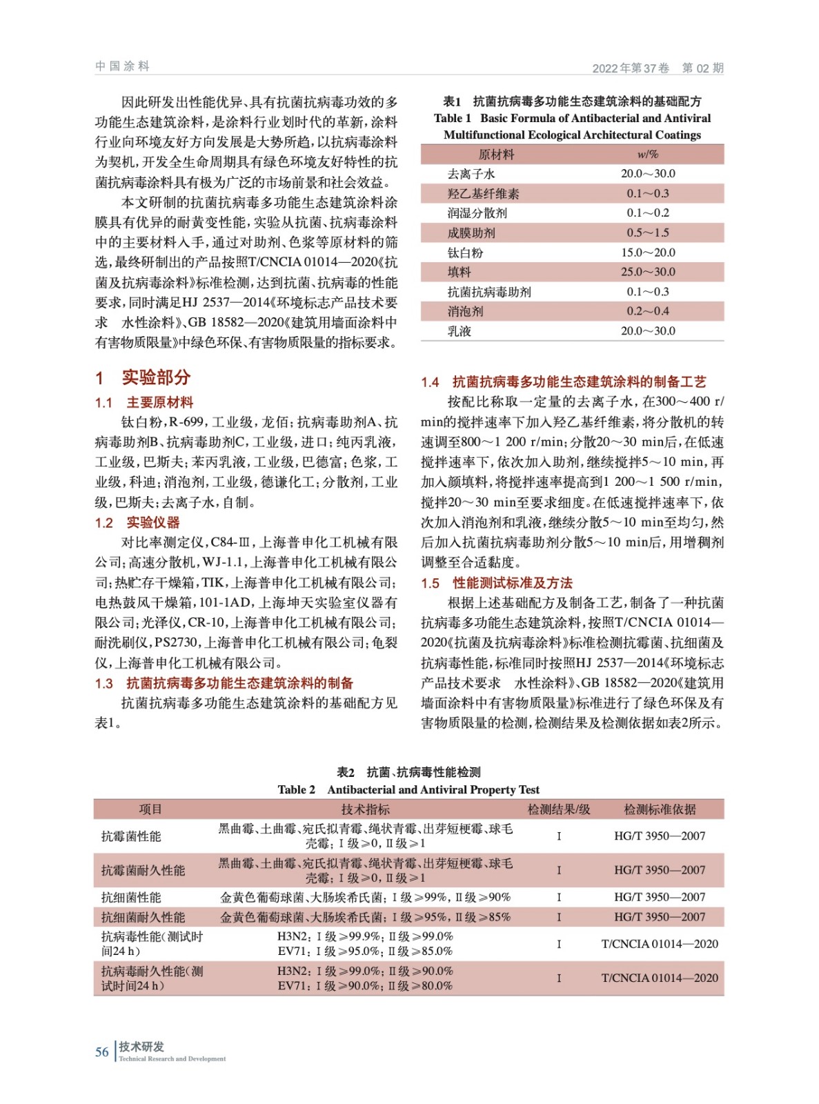 介紹了一種抗菌抗病毒多功能生態建筑涂料的制備。篩選了一種集罐內防腐、涂膜防霉、抗菌、抗病毒等多功效為一體的抗菌抗病毒助劑,同時闡述了抗菌抗病毒多功能生態建筑涂料的制備過程以及抗菌抗病毒助劑對產品性能的影響,此涂料的制備具有廣闊的市場前景和經濟效益。