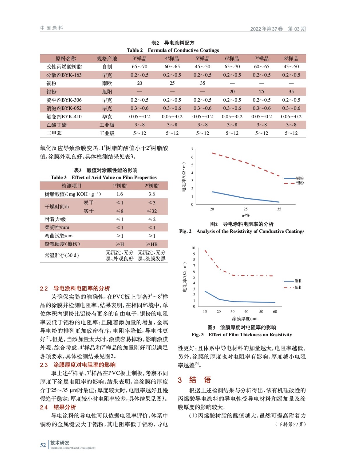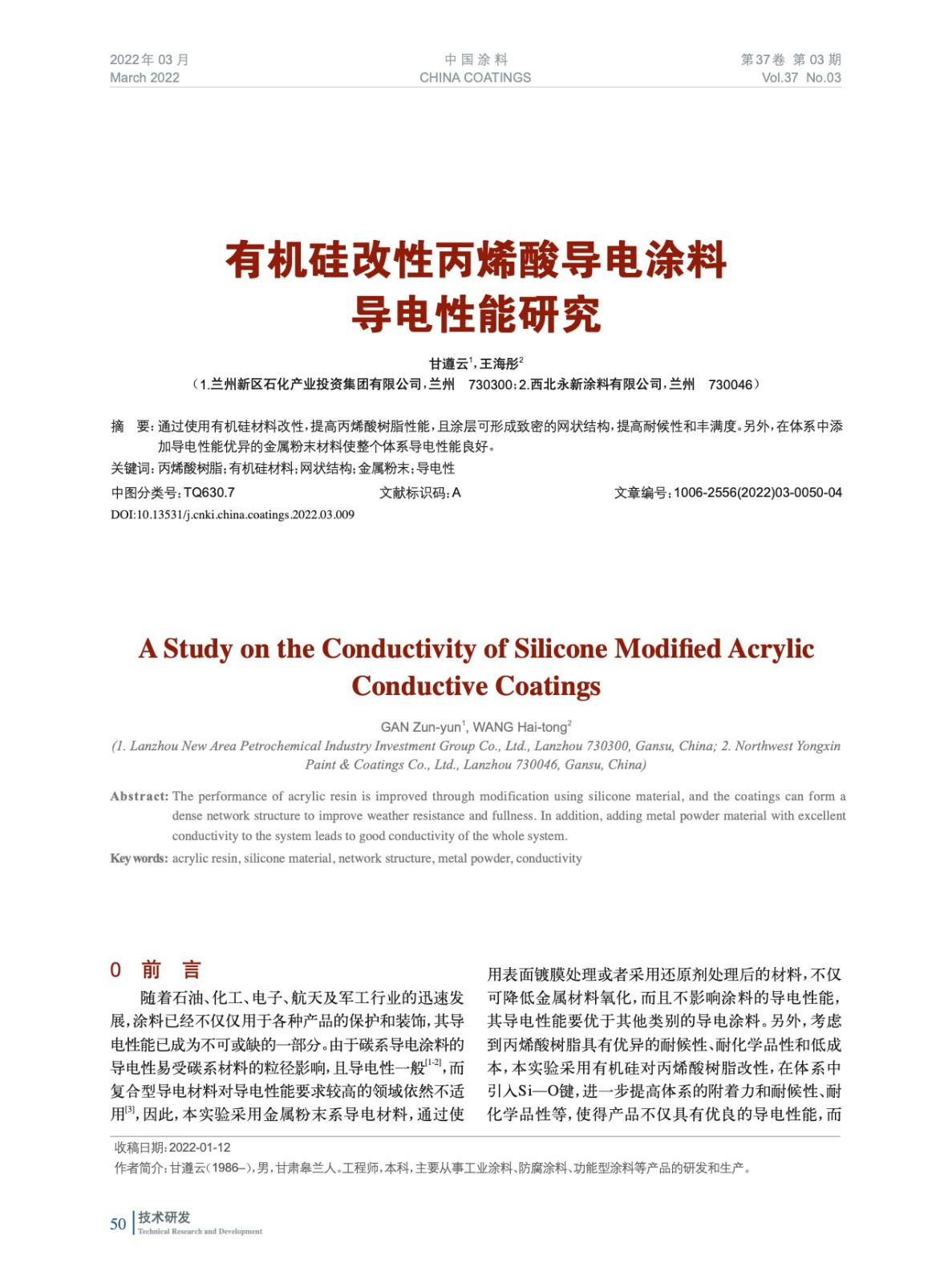 通過使用有機硅材料改性,提高丙烯酸樹脂性能,且涂層可形成致密的網狀結構,提高耐候性和豐滿度。另外,在體系中添加導電性能優異的金屬粉末材料使整個體系導電性能良好。