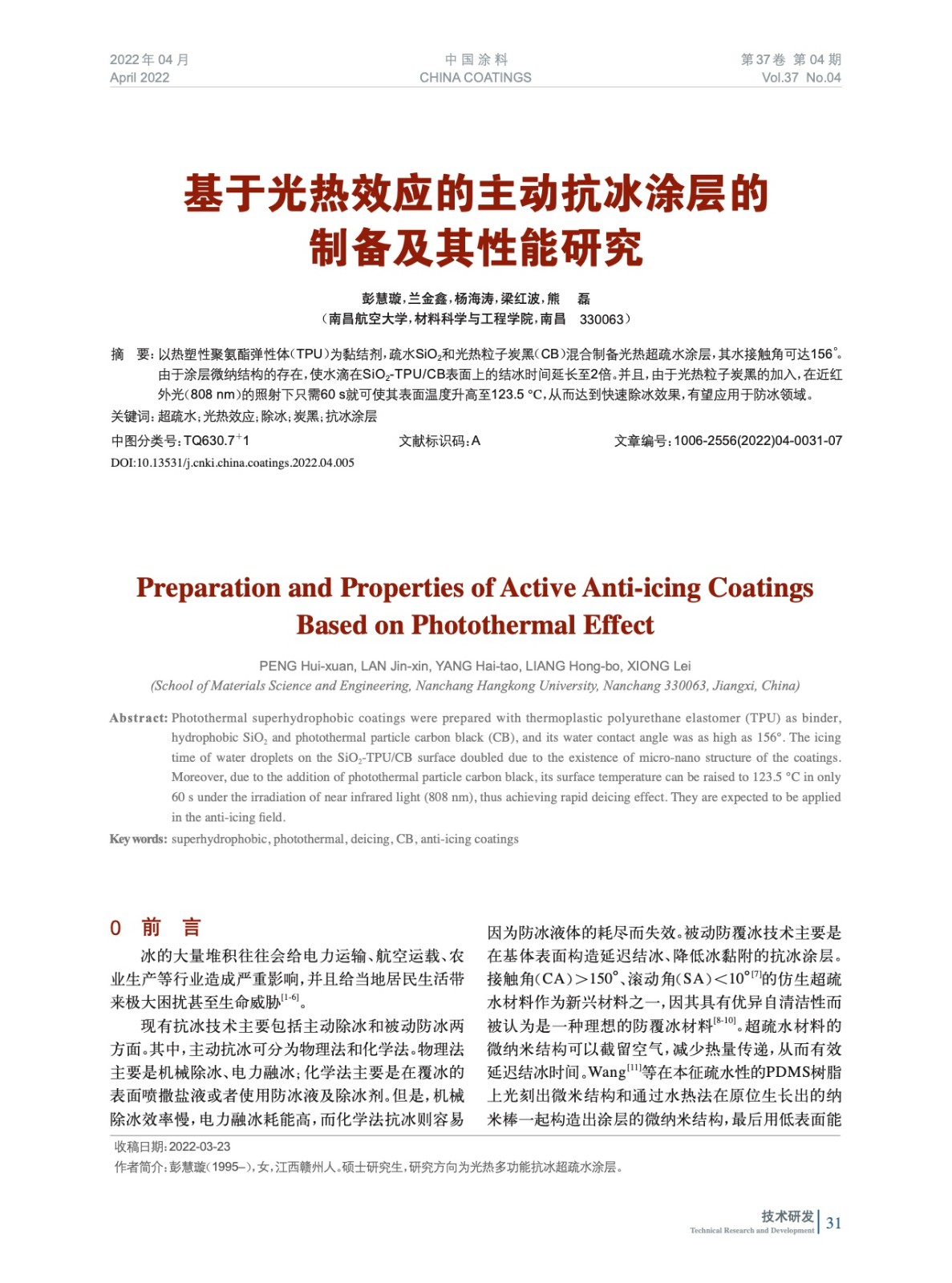 基于光熱效應(yīng)的主動抗冰涂層的制備及其性能研究