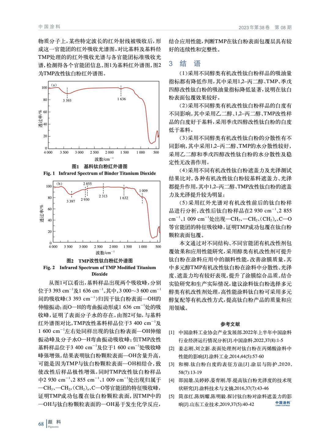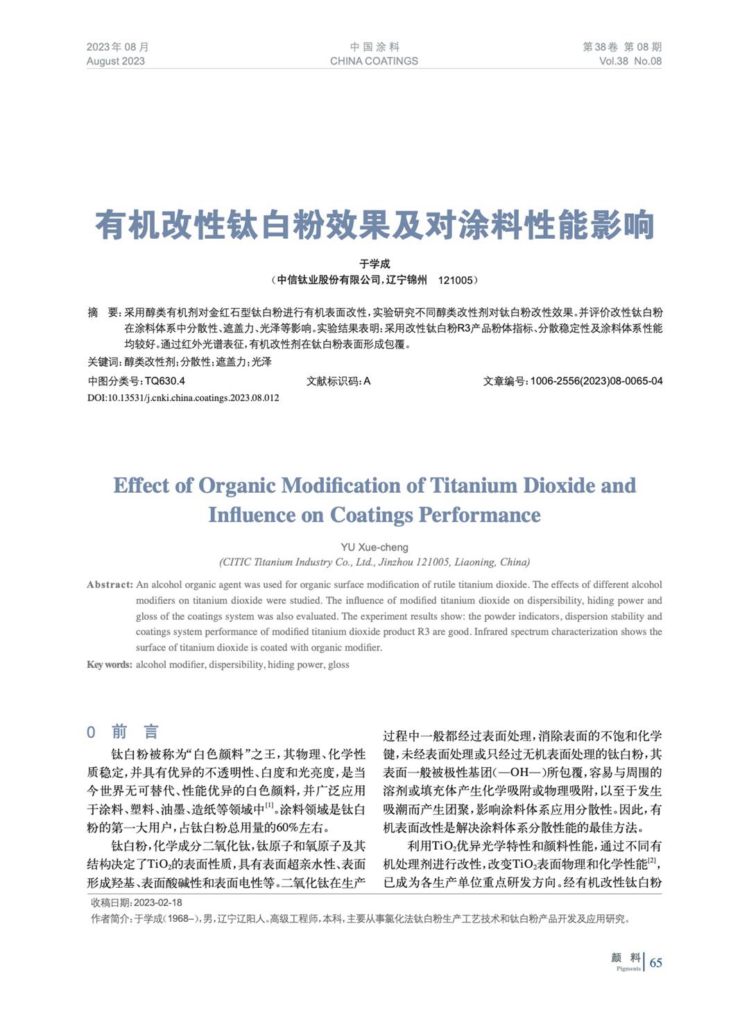 采用醇類有機劑對金紅石型鈦白粉進行有機表面改性,實驗研究不同醇類改性劑對鈦白粉改性效果。并評價改性鈦白粉在涂料體系中分散性、遮蓋力、光澤等影響。實驗結果表明:采用改性鈦白粉R3產品粉體指標、分散穩定性及涂料體系性能均較好。通過紅外光譜表征,有機改性劑在鈦白粉表面形成包覆。