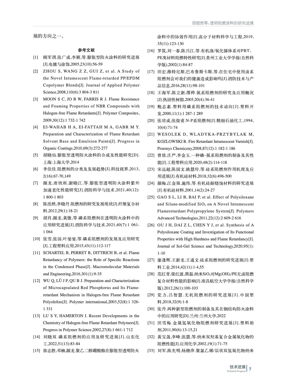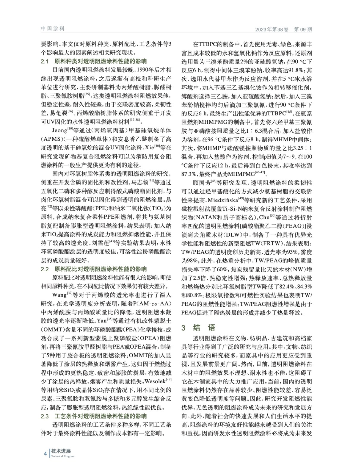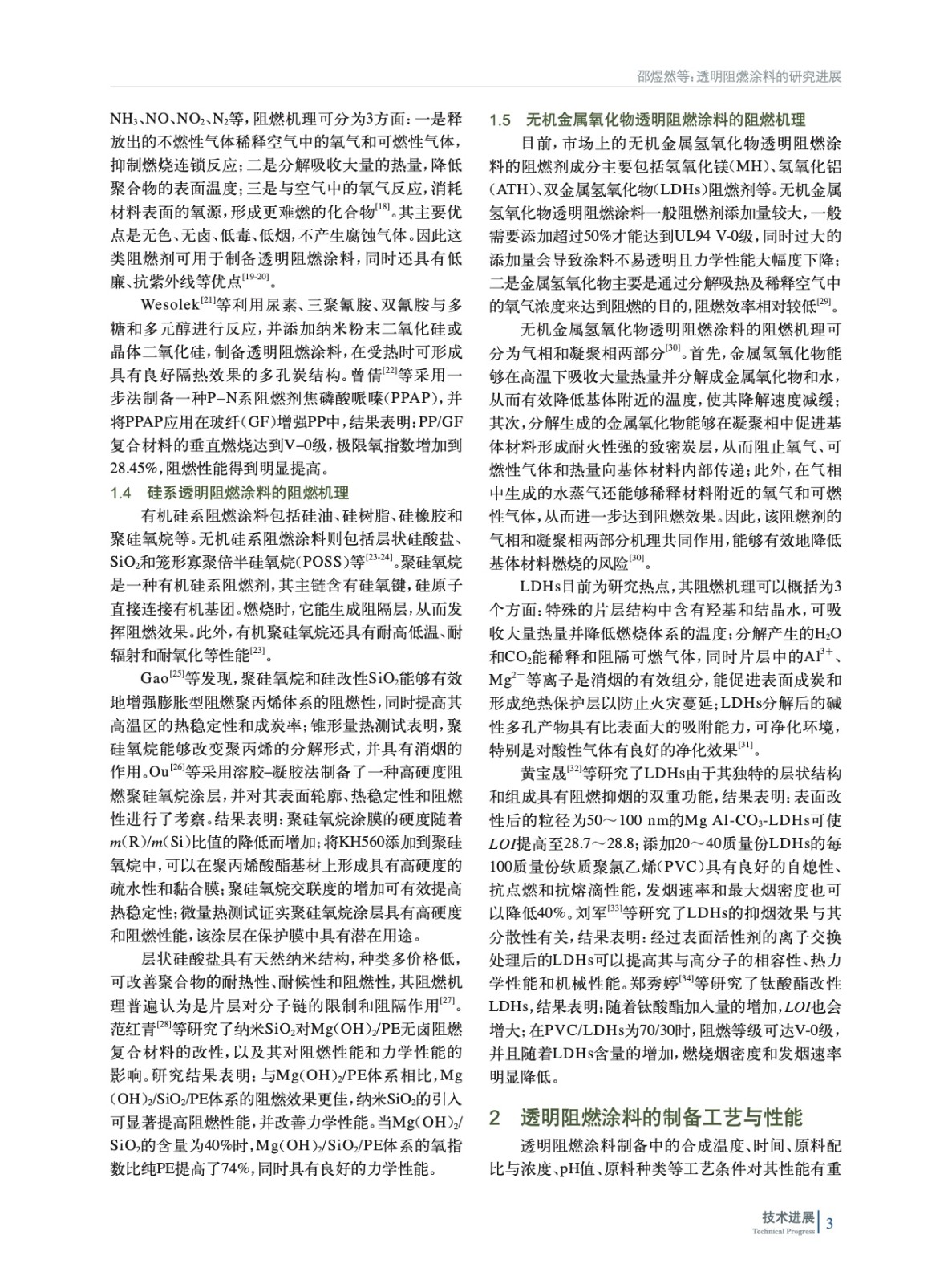 系統闡述了磷系、鹵系、氮系、硅系以及無機金屬氫氧化物等透明阻燃涂料的機理,以及原料種類、原料配比、工藝條件等對其制備工藝與性能的影響等方面的研究現狀,并展望了透明阻燃涂料的研究與應用前景。
