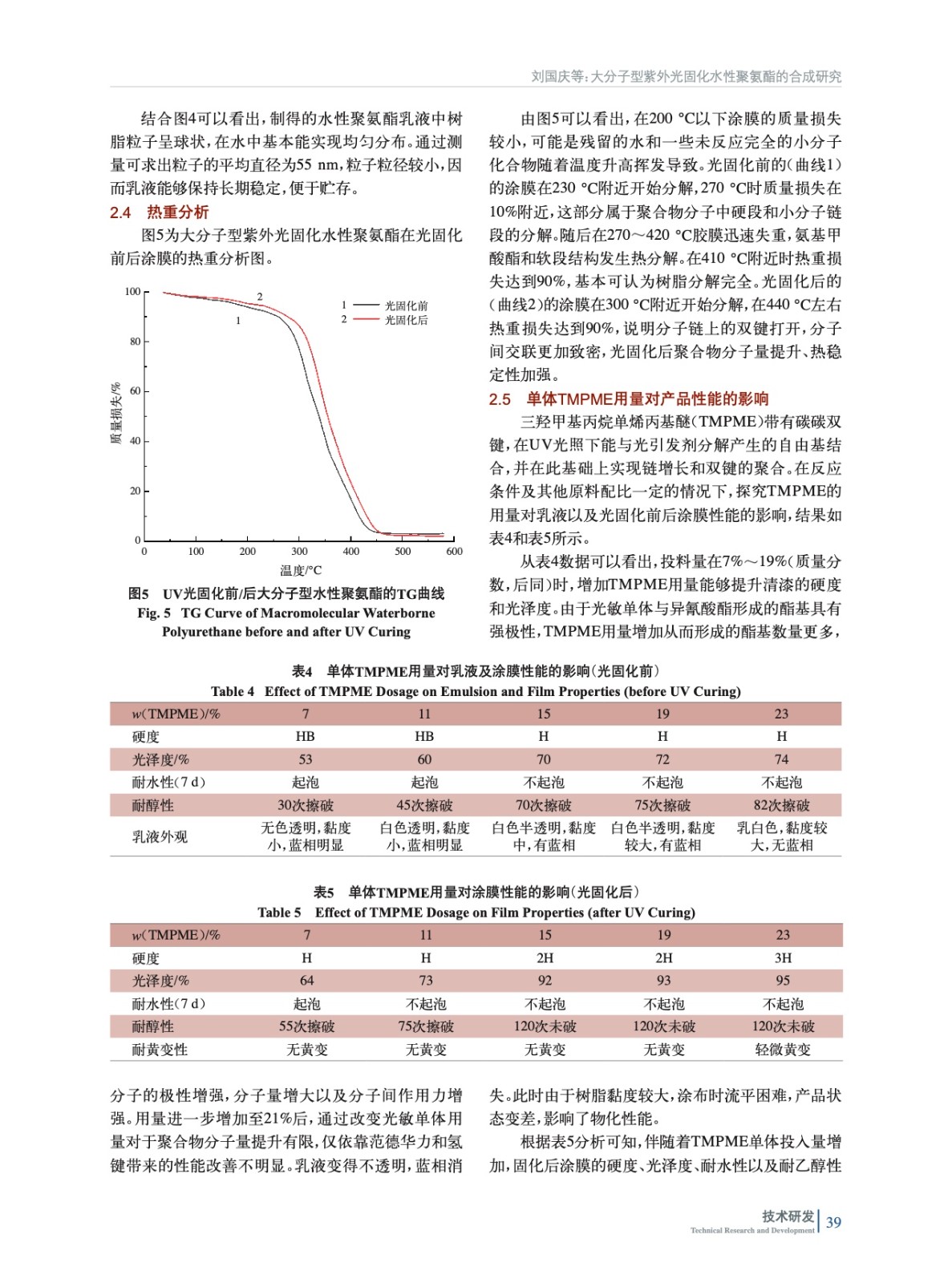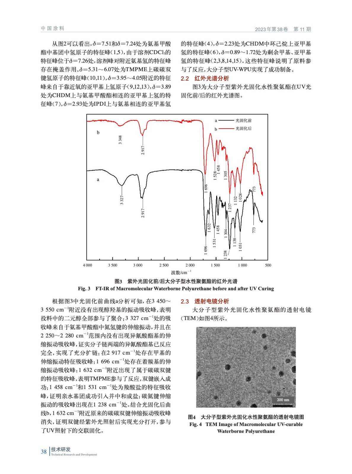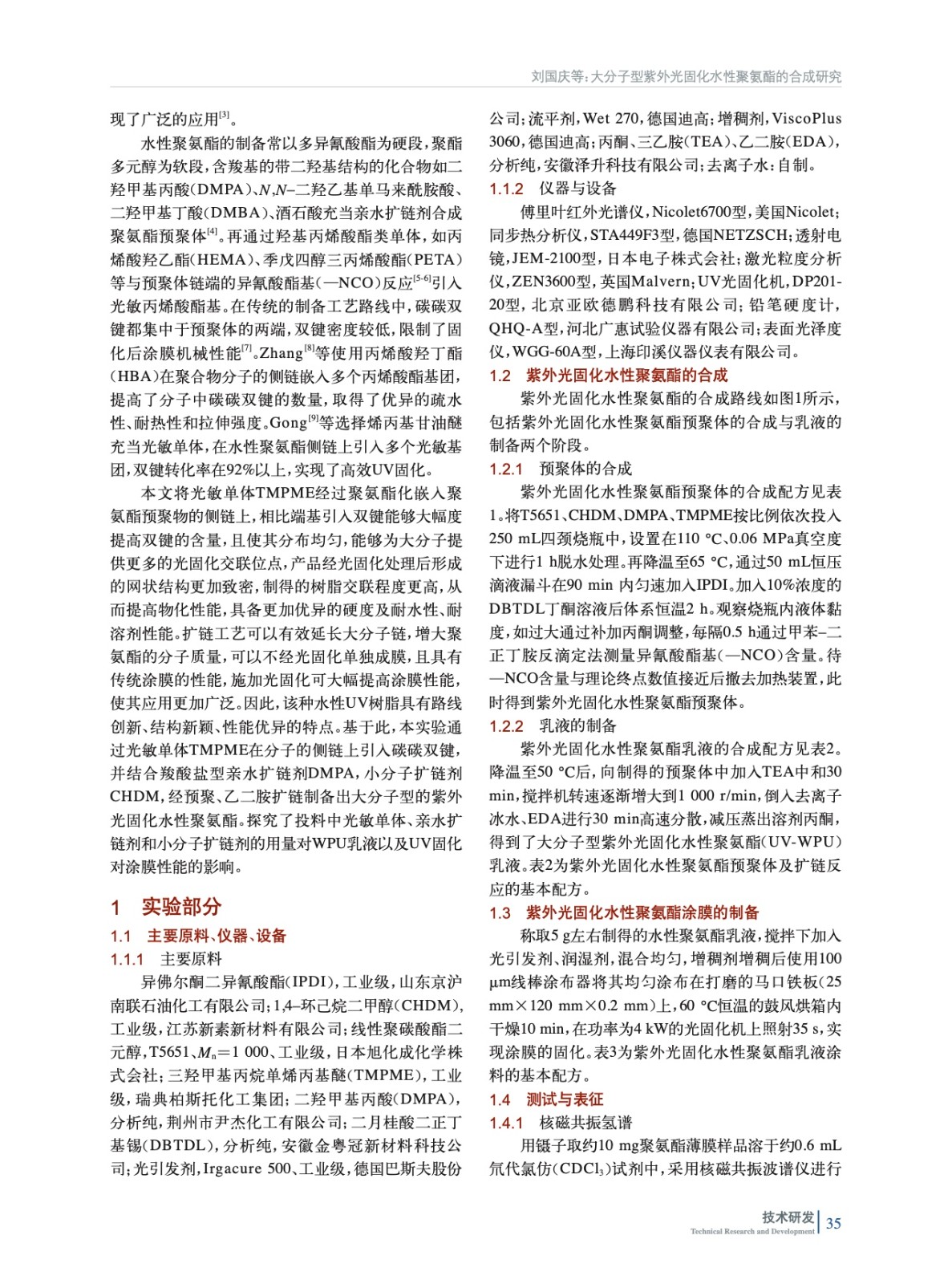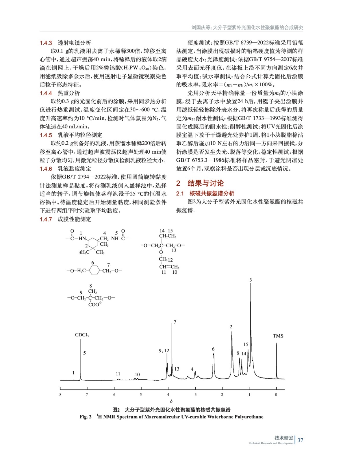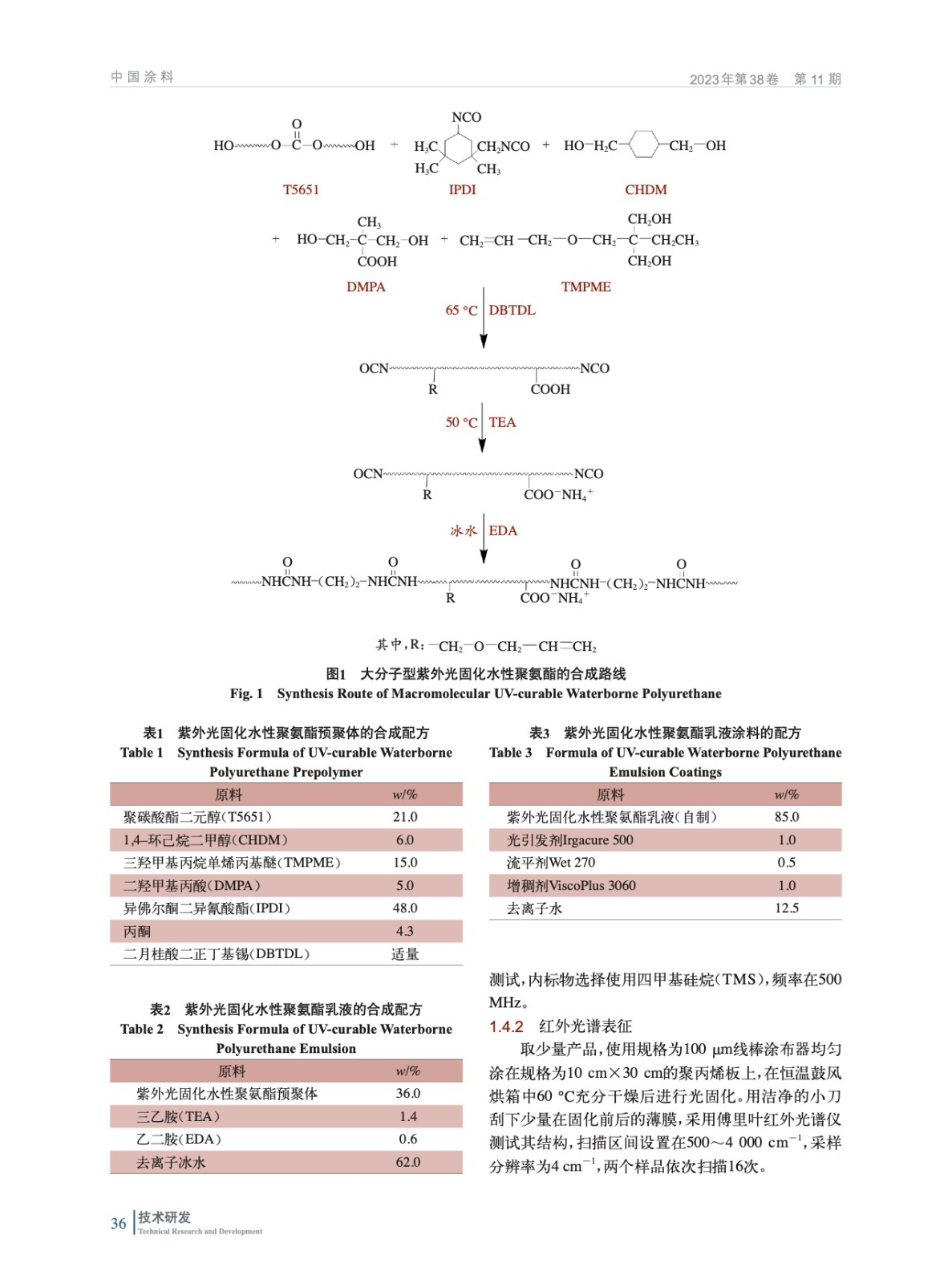 摘要:采用異佛爾酮二異氰酸酯(IPDI)以及1,4–環(huán)己烷二甲醇(CHDM)充當(dāng)硬段,線性聚碳酸酯二元醇(T5651)作為軟段,三羥甲基丙烷單烯丙基醚(TMPME)充當(dāng)光敏單體,二羥甲基丙酸(DMPA)為親水單體,通過擴鏈合成了大分子型紫外光固化水性聚氨酯(UV-WPU)。結(jié)合核磁共振波譜(NMR)、傅里葉紅外光譜(FT-IR)、透射電鏡(TEM)、熱重分析(TGA)以及激光粒度分析儀對合成的乳液及涂膜的結(jié)構(gòu)與性能進行了表征,探討了TMPME、DMPA、CHDM用量和光固化工藝對于樹脂乳液以及成膜后性能的影響。結(jié)果表明:當(dāng)TMPME質(zhì)量分?jǐn)?shù)為15%,CHDM、DMPA質(zhì)量分?jǐn)?shù)分別為6%、5%時制得的聚氨酯乳液貯存穩(wěn)定、性能優(yōu)異;經(jīng)紫外光固化35 s后涂膜硬度高、不黃變,耐溶劑性好。