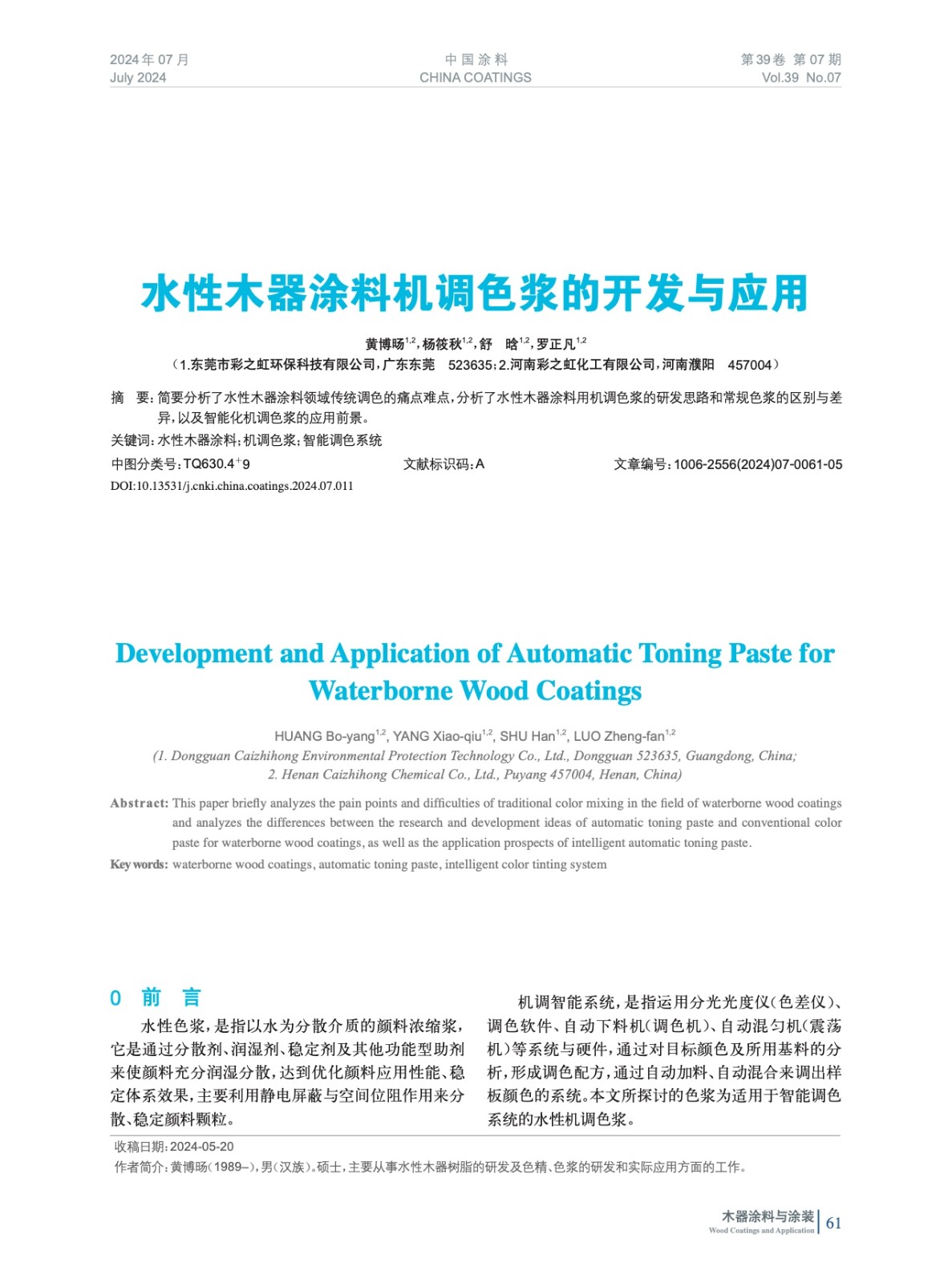 簡要分析了水性木器涂料領域傳統調色的痛點難點,分析了水性木器涂料用機調色漿的研發思路和常規色漿的區別與差異,以及智能化機調色漿的應用前景。