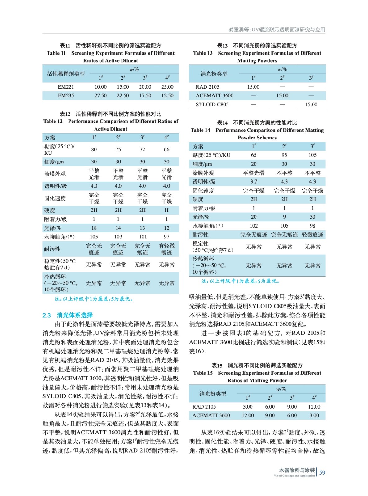 對UV輥涂耐污透明面漆,從UV樹脂、活性稀釋劑、消光粉和流平劑選擇等方面進行探討,通過實驗論證以及輥涂設備應用測試,驗證了其在工業化應用上的可行性。