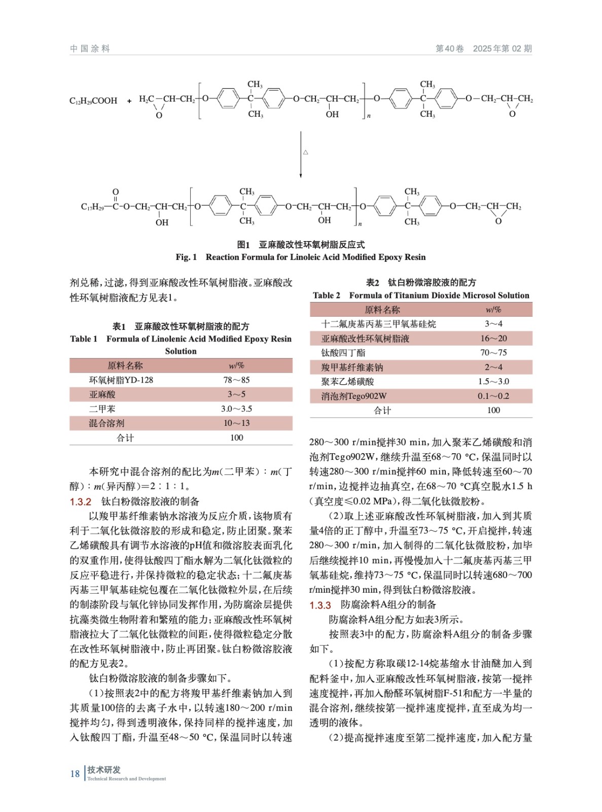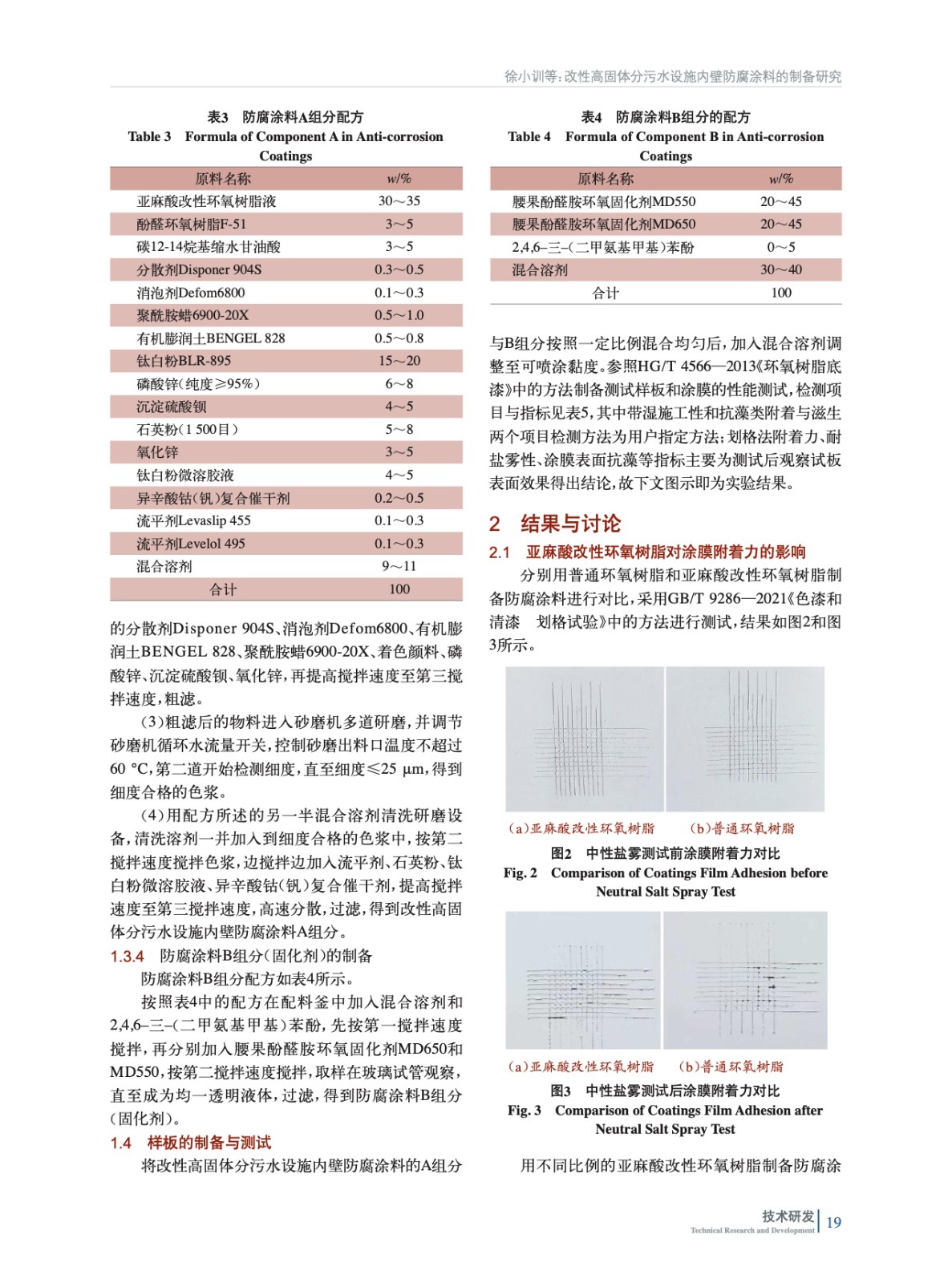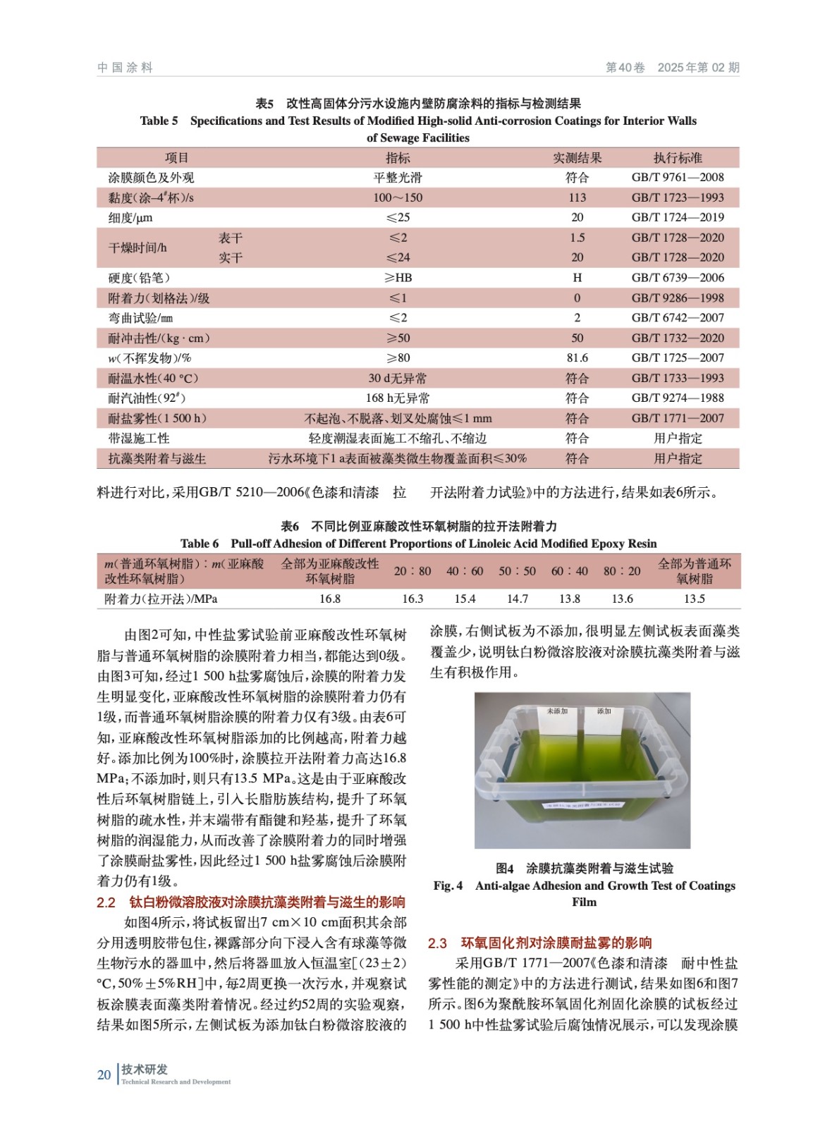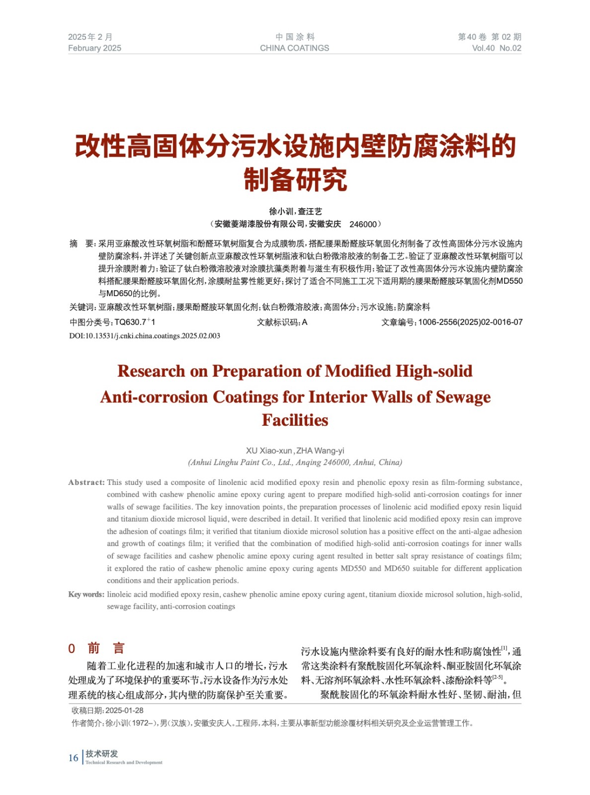 摘要:采用亞麻酸改性環氧樹脂和酚醛環氧樹脂復合為成膜物質,搭配腰果酚醛胺環氧固化劑制備了改性高固體分污水設施內壁防腐涂料,并詳述了關鍵創新點亞麻酸改性環氧樹脂液和鈦白粉微溶膠液的制備工藝。驗證了亞麻酸改性環氧樹脂可以提升涂膜附著力;驗證了鈦白粉微溶膠液對涂膜抗藻類附著與滋生有積極作用;驗證了改性高固體分污水設施內壁防腐涂料搭配腰果酚醛胺環氧固化劑,涂膜耐鹽霧性能更好;探討了適合不同施工工況下適用期的腰果酚醛胺環氧固化劑MD550與MD650的比例。