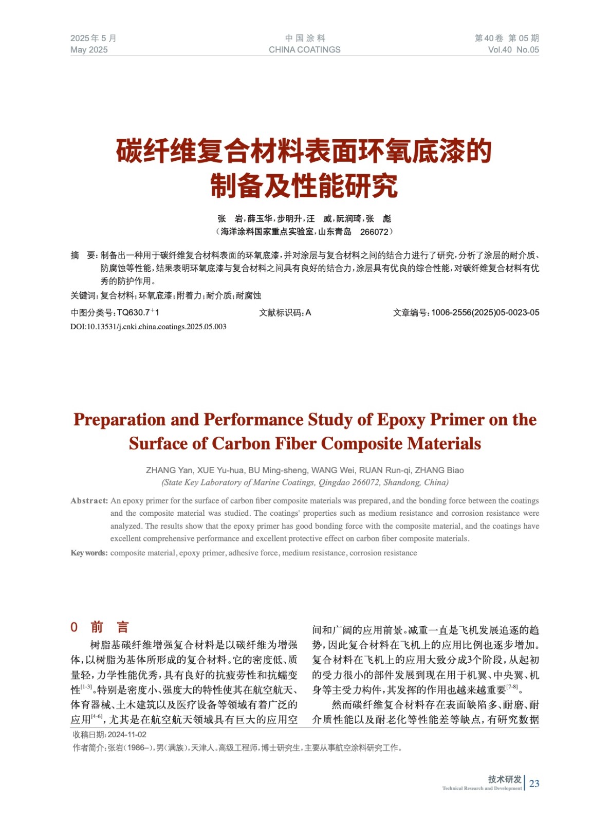 制備出一種用于碳纖維復合材料表面的環氧底漆,并對涂層與復合材料之間的結合力進行了研究,分析了涂層的耐介質、防腐蝕等性能,結果表明環氧底漆與復合材料之間具有良好的結合力,涂層具有優良的綜合性能,對碳纖維復合材料有優秀的防護作用。