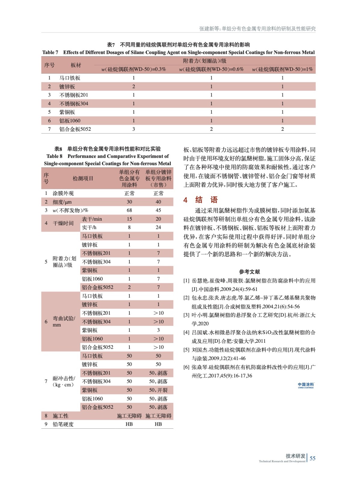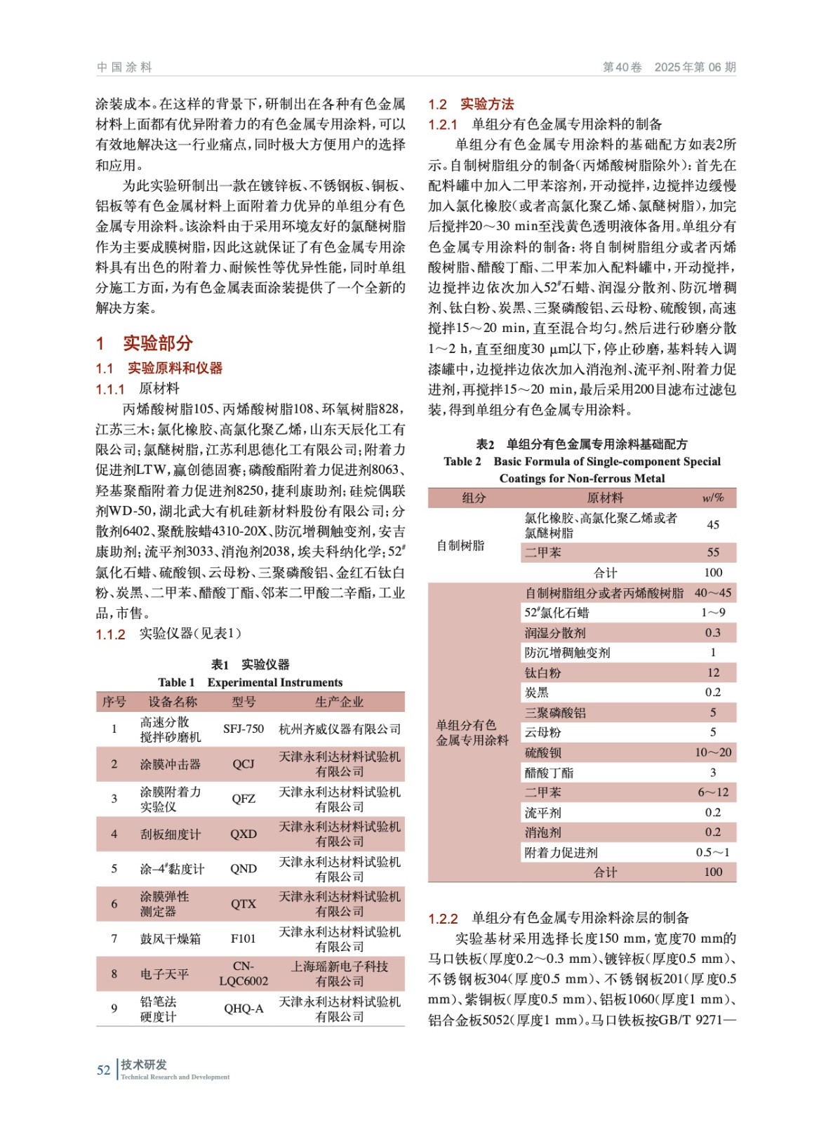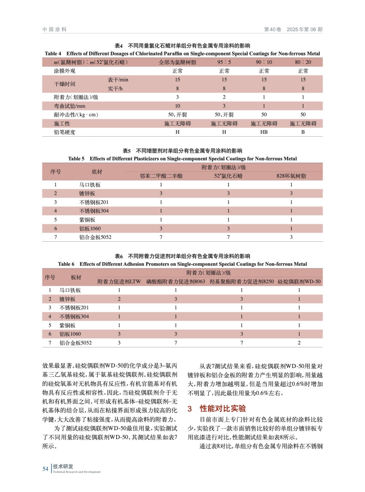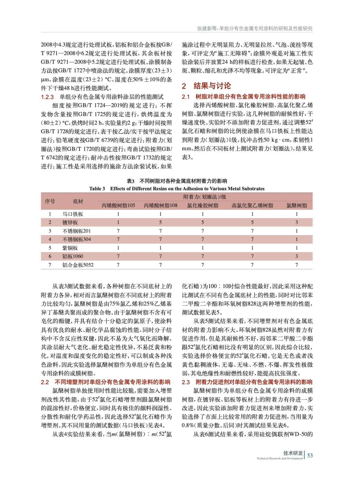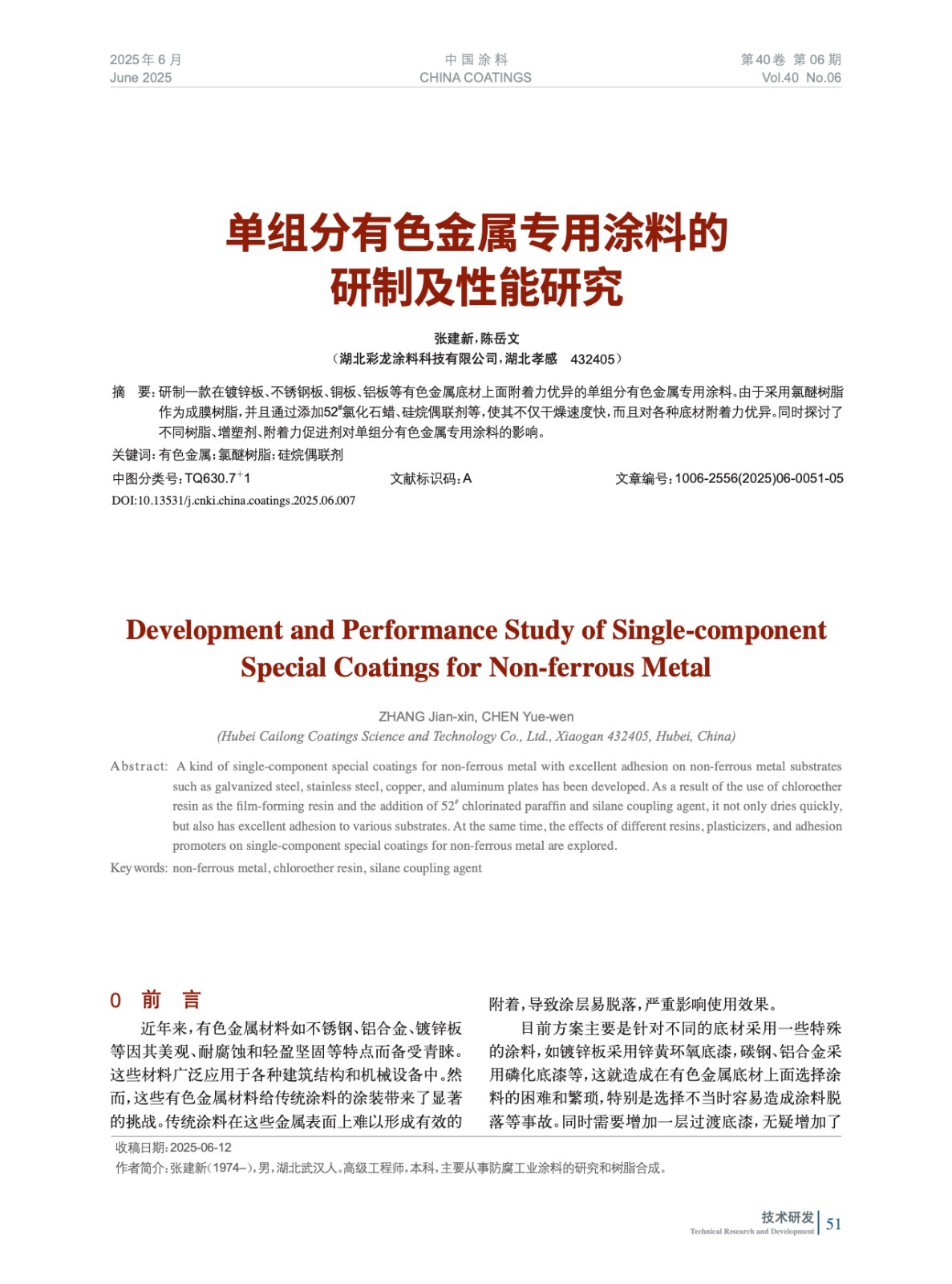 摘要:研制一款在鍍鋅板、不銹鋼板、銅板、鋁板等有色金屬底材上面附著力優(yōu)異的單組分有色金屬專用涂料。由于采用氯醚樹脂作為成膜樹脂,并且通過添加52#氯化石蠟、硅烷偶聯(lián)劑等,使其不僅干燥速度快,而且對各種底材附著力優(yōu)異。同時探討了不同樹脂、增塑劑、附著力促進(jìn)劑對單組分有色金屬專用涂料的影響。