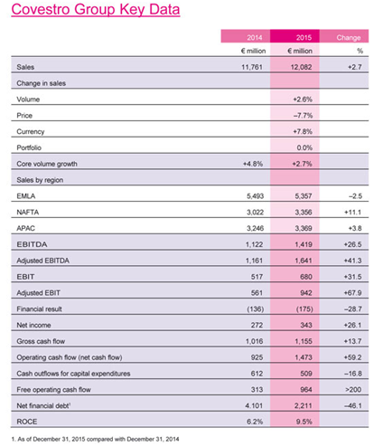 下圖是關于科思創(chuàng)公司2015財年報告的關鍵數(shù)據(jù):
