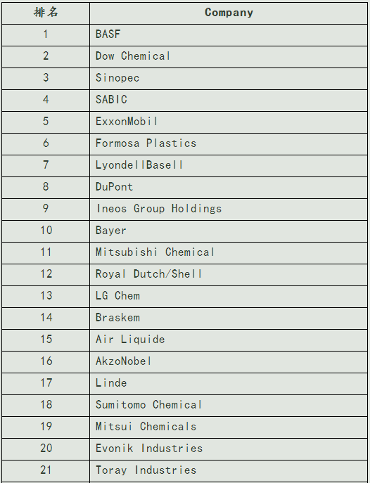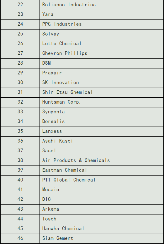 在今年的榜單中排名第二至第十的分別是陶氏化學(xué)、中石化、SABIC、埃克森美孚、臺(tái)塑、利安德巴賽爾、杜邦、英力士和拜耳。排名與去年變化不大,只有德國拜耳公司從去年的第十一名上升至今年的第十名。