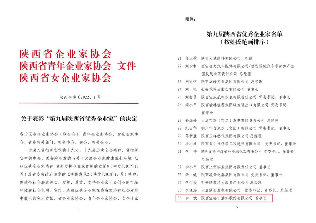 近日,由陜西省企業(yè)家協(xié)會(huì)于2021年-2022年在全省范圍內(nèi)聯(lián)合開展的評(píng)選“第九屆陜西省優(yōu)秀企業(yè)家”活動(dòng)落下帷幕,經(jīng)過(guò)現(xiàn)場(chǎng)考評(píng)、網(wǎng)絡(luò)公示等嚴(yán)格考核,在陜西省范圍內(nèi)共評(píng)選出84名優(yōu)秀企業(yè)家,陜西寶塔山油漆股份有限公司董事長(zhǎng)李斌獲評(píng)“第九屆陜西省優(yōu)秀企業(yè)家”稱號(hào)。