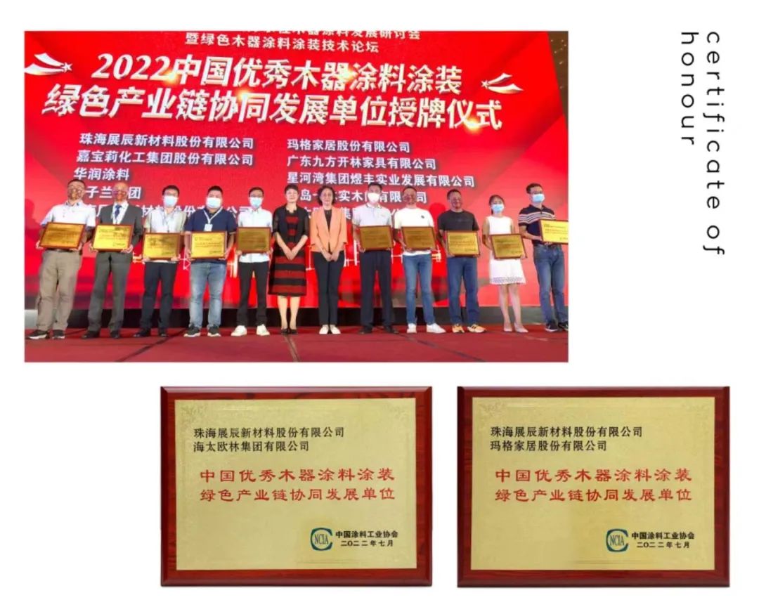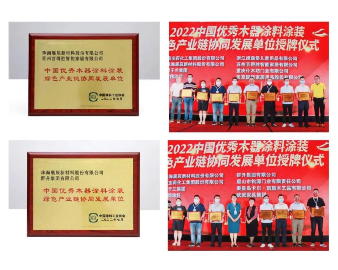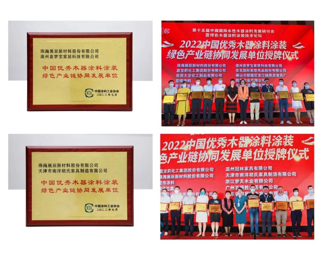 展辰新材與海太歐林、南洋胡氏家具、群升集團、百得勝智能家居、喜夢寶家居、瑪格家居一起,被評為“2022中國優(yōu)秀木器涂料涂裝綠色產(chǎn)業(yè)鏈協(xié)同發(fā)展單位”。