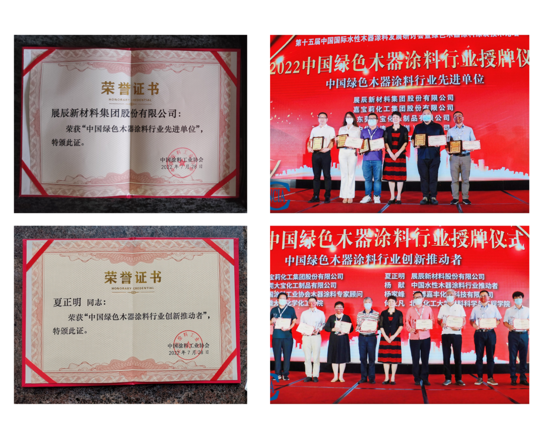 展辰新材料集團股份有限公司榮膺“中國綠色木器涂料行業(yè)先進單位”稱號,同時展辰新材料集團股份有限公司夏正明榮獲“中國綠色木器涂料行業(yè)創(chuàng)新推動者”稱號。