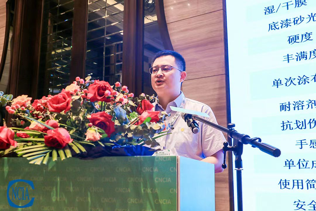 在會上,展辰技術(shù)管理中心涂料研發(fā)部經(jīng)理夏正明還為大家?guī)砹恕督堤紲p排—木器綠色涂裝創(chuàng)新方案分享》的主題演講,從實際應(yīng)用角度講解水性木器涂料降碳減排的新思路和新工藝。