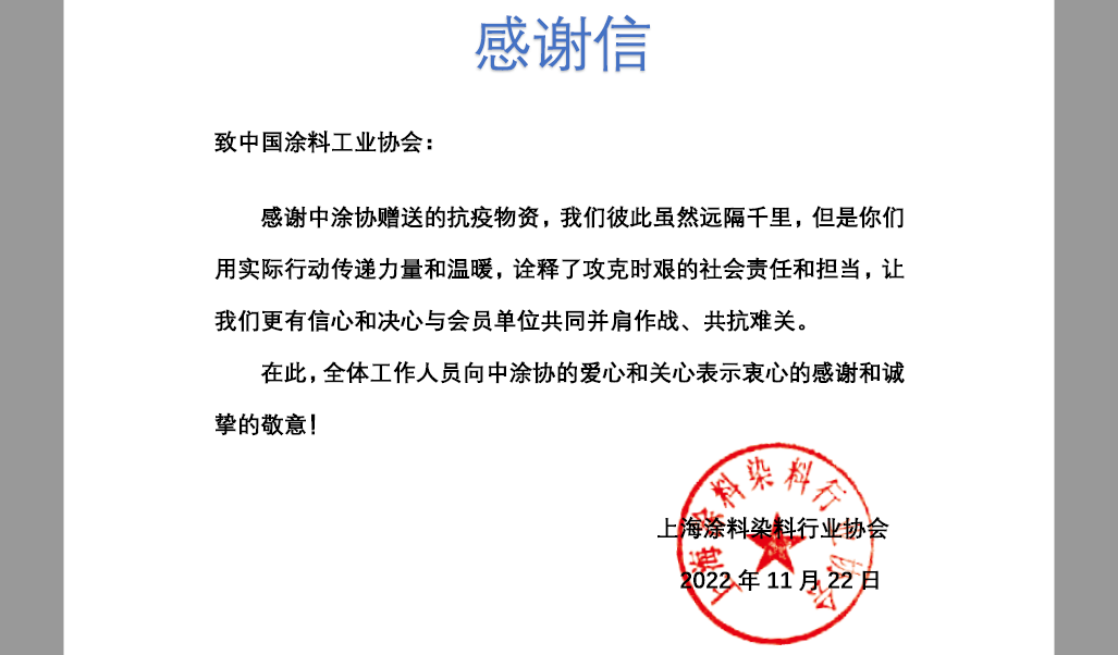 上海涂料染料行業(yè)協(xié)會(huì)感謝信