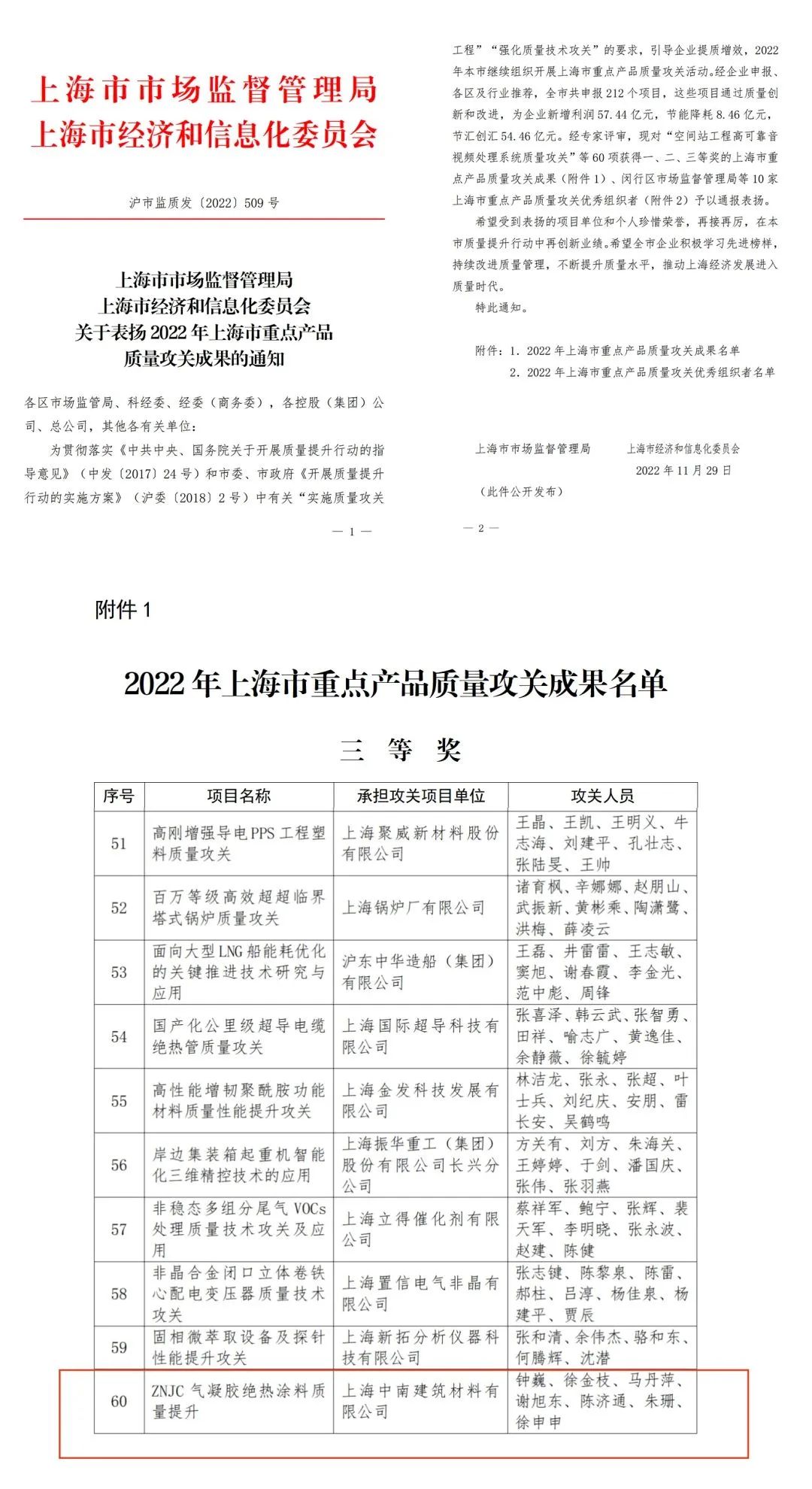 經企業申報、各區及行業推薦,全市共申報212個項目,這些項目通過質量創新和改進,為企業新增利潤57.44億元,節能降耗8.46億元,節匯創匯54.46億元。經專家評審,共計評選出60項上海市重點產品質量攻關成果獎。其中,中南建材“ZNJC氣凝膠絕熱涂料質量提升”項目榮獲2022年上海市重點產品質量攻關成果三等獎。