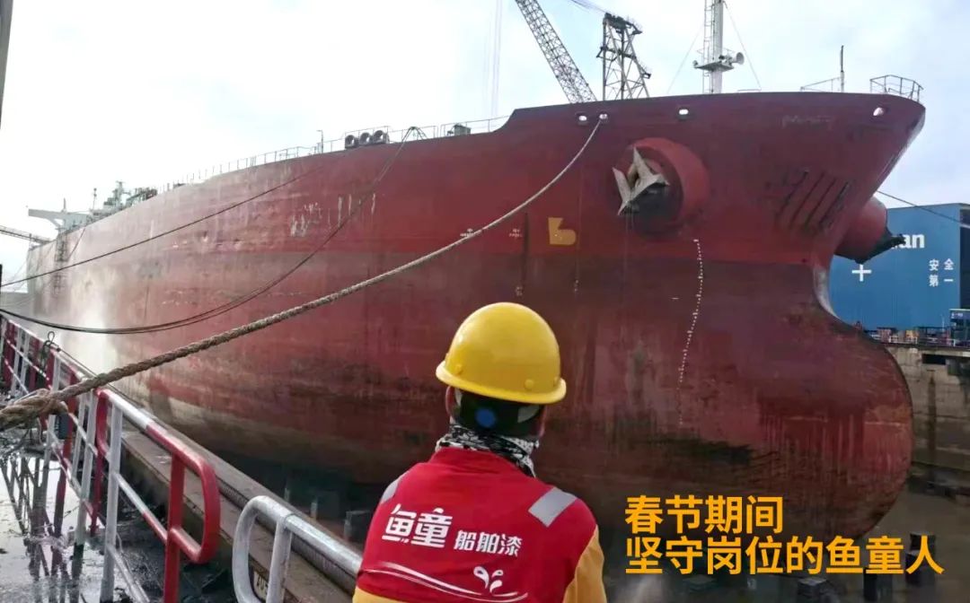 15萬DWT油船船長274米,寬48米,型深23米,是海上巨無霸。這個項目工期恰逢春節(jié)假期,魚童面臨著巨輪涂裝面積大、工期緊、人員不足、物流難等挑戰(zhàn)。為配合船廠施工進度,魚童從生產(chǎn)到物流供應(yīng)鏈保障,再到現(xiàn)場的技術(shù)服務(wù)工程師們,他們舍棄了春節(jié)與家人團聚的時光,堅守崗位,用行動詮釋了責(zé)任與專業(yè),在寒凍的天氣里為客戶提供溫暖貼心的服務(wù),得到了船東和船廠的一致好評!在此,向每一個春節(jié)堅守崗位的人致敬,也向每一個奮斗路上的你致敬。