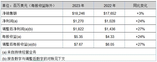 2023年度實現了創紀錄的凈銷售額,約為182億美元,較上年增長3%左右。在銷售價格上漲的帶動下,有機銷售額增長了3%。調整后每股收益也創下歷史新高,增長了27%,原因包括銷售價格上漲、投入成本下調、結構性成本節省和有利的外幣折算,但被銷量下降部分抵消。年末,投入成本和庫存水平仍高于歷史水平。