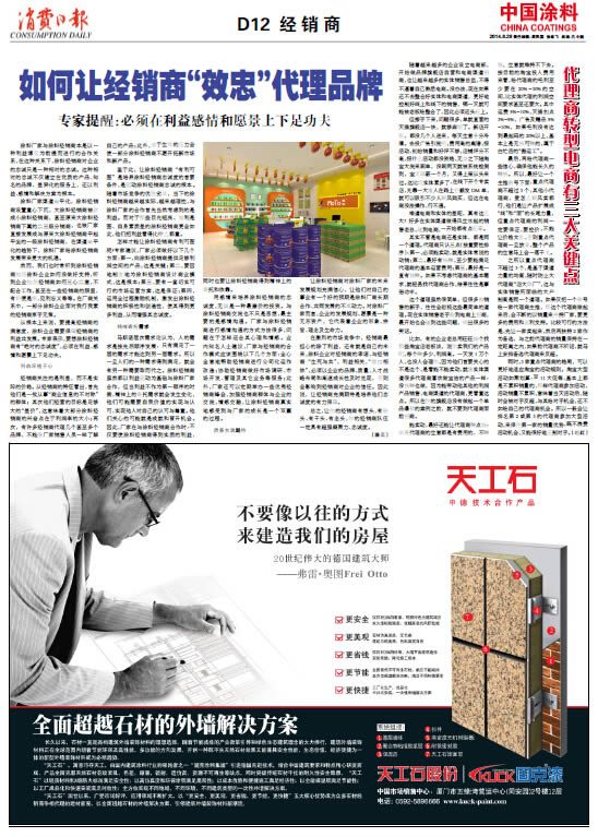 怎樣才能讓涂料經銷商有利可圖呢?專家建議,廠家必須做好以下幾個方面:第一,向涂料經銷商提供足夠利潤空間的產品,這是關鍵;第二,要因地制宜地為涂料經銷商設計商業模式,這是根本;第三,要有一套切實可行的市場運營方案,這是保證;第四,運用全過程激勵機制,激發出涂料經銷商的積極性和創造性,使其得到更多利益,從而增強其忠誠度。